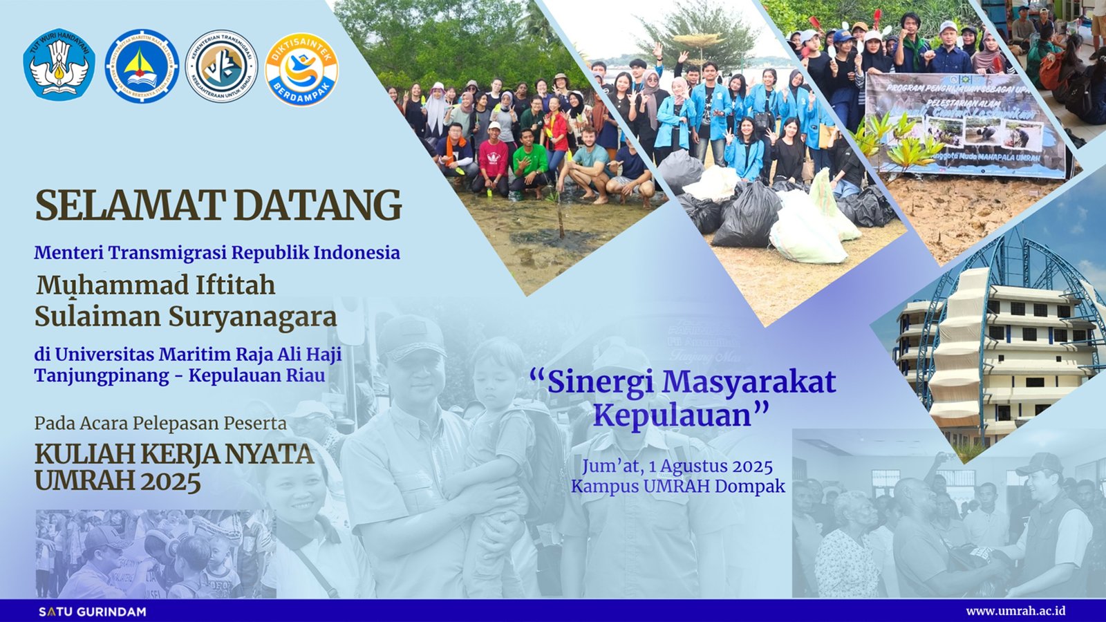 TANJUNGPINANG – Sebanyak 1.284 mahasiswa Universitas Maritim Raja Ali Haji (UMRAH) siap diterjunkan untuk menjalankan Kuliah Kerja Nyata (KKN) tahun 2025. Pelepasan mahasiswa KKN ini akan dilakukan langsung oleh Menteri Transmigrasi Republik Indonesia, Muhammad Iftitah Sulaiman Suryanagara, didampingi Rektor UMRAH, Prof. Dr. Agung Dhamar Syakti, S.Pi., DEA.