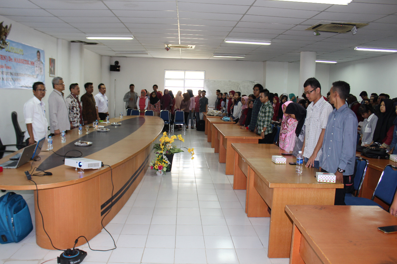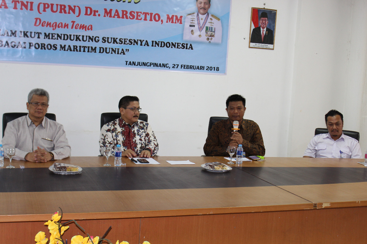 Dompak – Anggota Dewan Pertimbangan UMRAH, Laksamana (Purn) Dr. Marsetio untuk kesekian kalinya hadir di Universitas Maritim Raja Ali Haji (UMRAH) sempena memberikan kuliah Umum kepada 100 orang mahasiswa UMRAH, Selasa(27/2/2018) bertempat di ruang rapat serbaguna lantai tiga Rektorat UMRAH Dompak.
