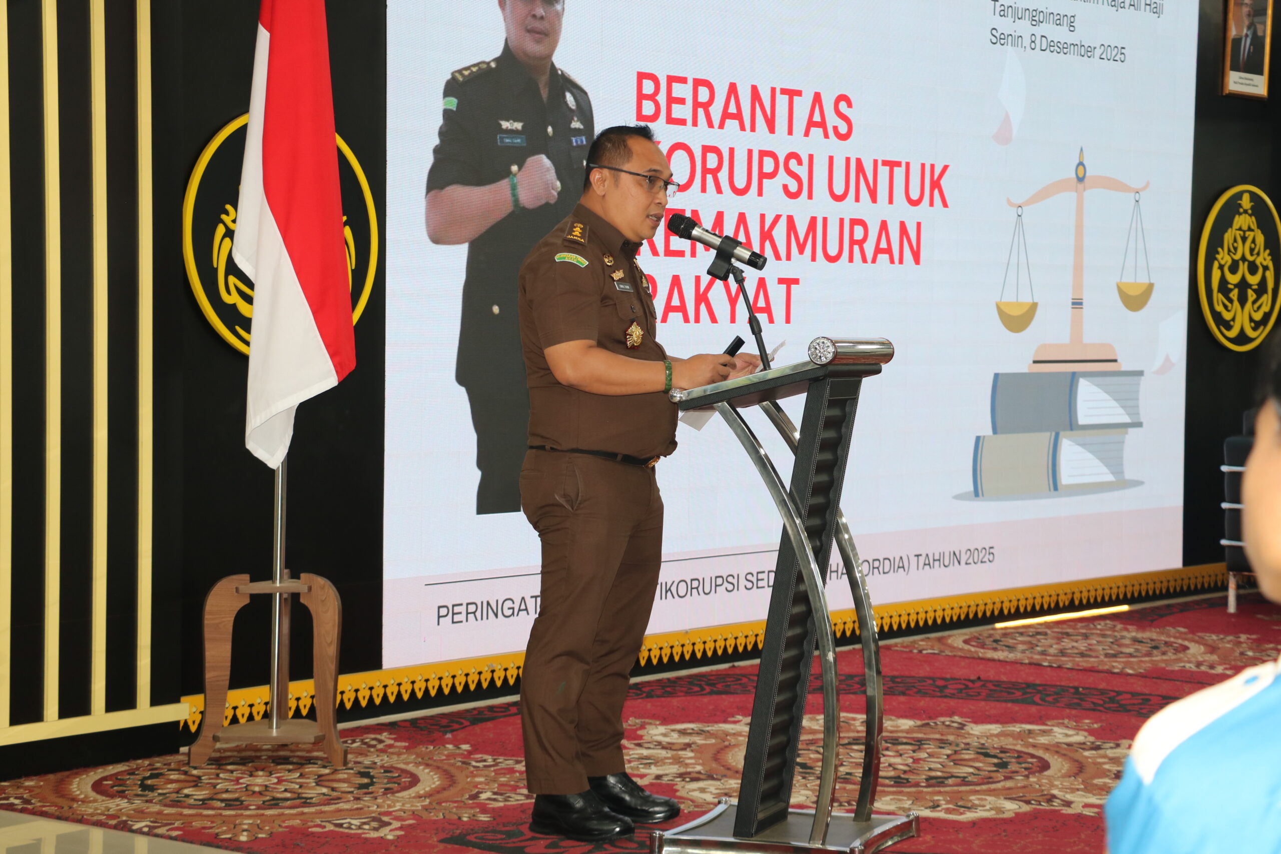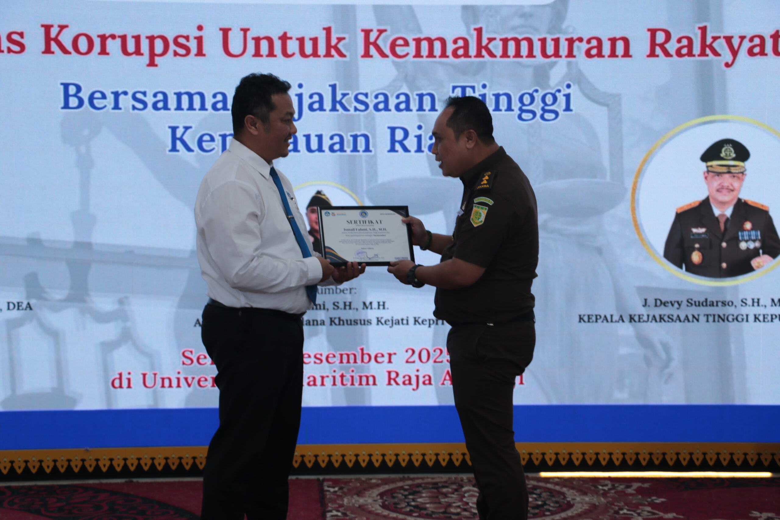 TANJUNGPINANG – Universitas Maritim Raja Ali Haji (UMRAH) terus memperkuat budaya integritas melalui penyelenggaraan Kuliah Umum dan Sosialisasi bertema “Berantas Korupsi Untuk Kemakmuran Rakyat” bersama Kejaksaan Tinggi Kepulauan Riau (Kejati Kepri). Kegiatan diikuti ratusan mahasiswa dan dihadiri jajaran Kejati Kepri, Kejari, Polresta Tanjungpinang, PWI, serta mitra UMRAH lainnya. Berlangsung di Hall Galeri Tamadun Maritim, Gedung A Satu Gurindam-Ismeth Abdullah, Kampus UMRAH Dompak. Senin (8/12).
