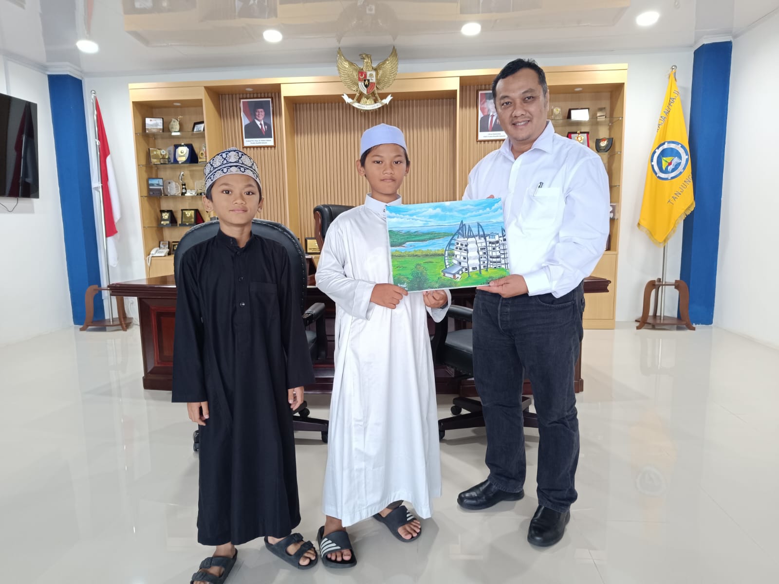 TANJUNGPINANG – Muhammad Ismail Sa’ad, seorang penggiat pelukis cilik asal Tanjungpinang yang juga merupakan siswa kelas VI Madrasah Ibtidaiyah Negeri (MIN) Tanjungpinang, menyerahkan karya lukisannya yang menggambarkan Gedung Satu Gurindam kepada Rektor Universitas Maritim Raja Ali Haji (UMRAH), Prof. Dr. Agung Dhamar Syakti, S.Pi, DEA. Penyerahan tersebut berlangsung di Ruang Kerja Rektor UMRAH, lantai 6 Gedung Satu Gurindam-Ismeth Abdullah. Senin (24/3).
