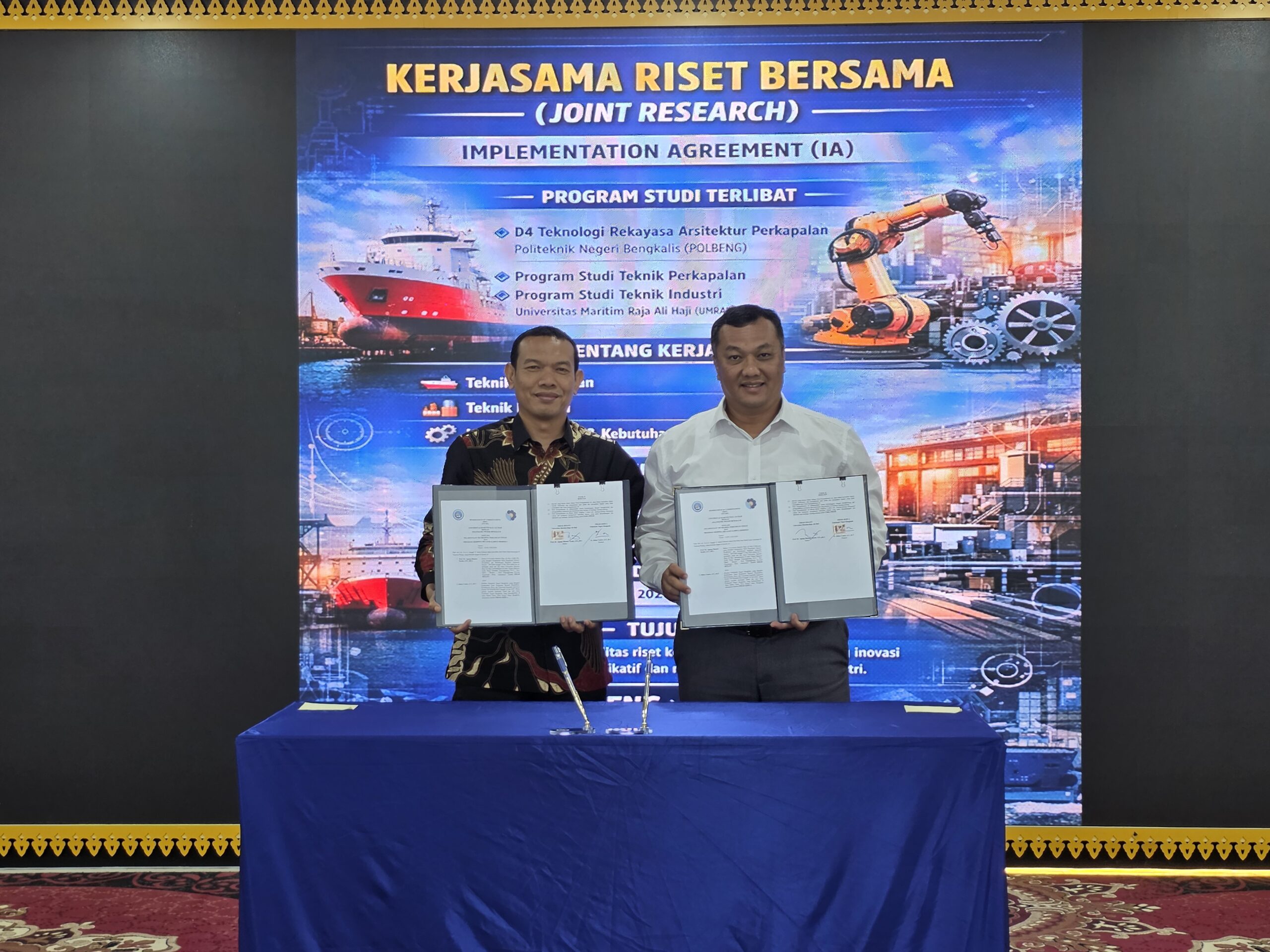 Penandatanganan MoU dilakukan langsung oleh Rektor UMRAH, Prof. Dr. Agung Dhamar Syakti, S.Pi., DEA, bersama Direktur Politeknik Negeri Bengkalis, Ir. Johny Custer, S.T., M.T. Pada kesempatan yang sama, kedua kampus juga menandatangani Memorandum of Agreement (MoA) dan Implementation Agreement (IA) antara Fakultas Teknik masing-masing, guna memperkuat kerjasama riset dan pengembangan keilmuan di bidang maritim dan industri.