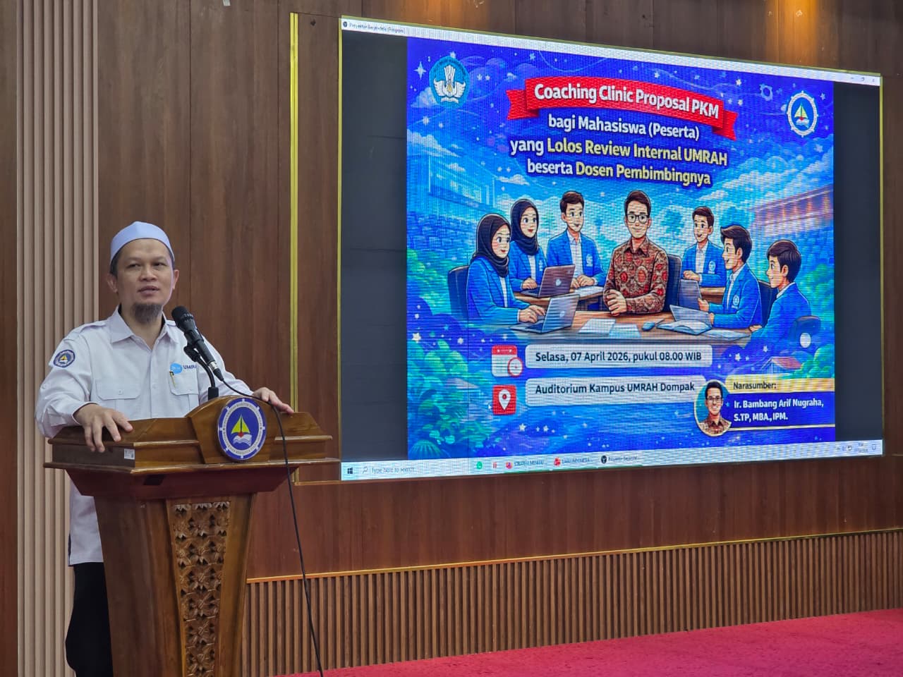 TANJUNGPINANG – Universitas Maritim Raja Ali Haji (UMRAH) menggelar kegiatan Coaching Clinic Proposal Program Kreativitas Mahasiswa (PKM) 2026 pada Selasa (7/4) di Auditorium Kampus UMRAH Dompak. Kegiatan ini diikuti oleh mahasiswa yang telah lolos tahap review internal, bersama dosen pendamping mereka.