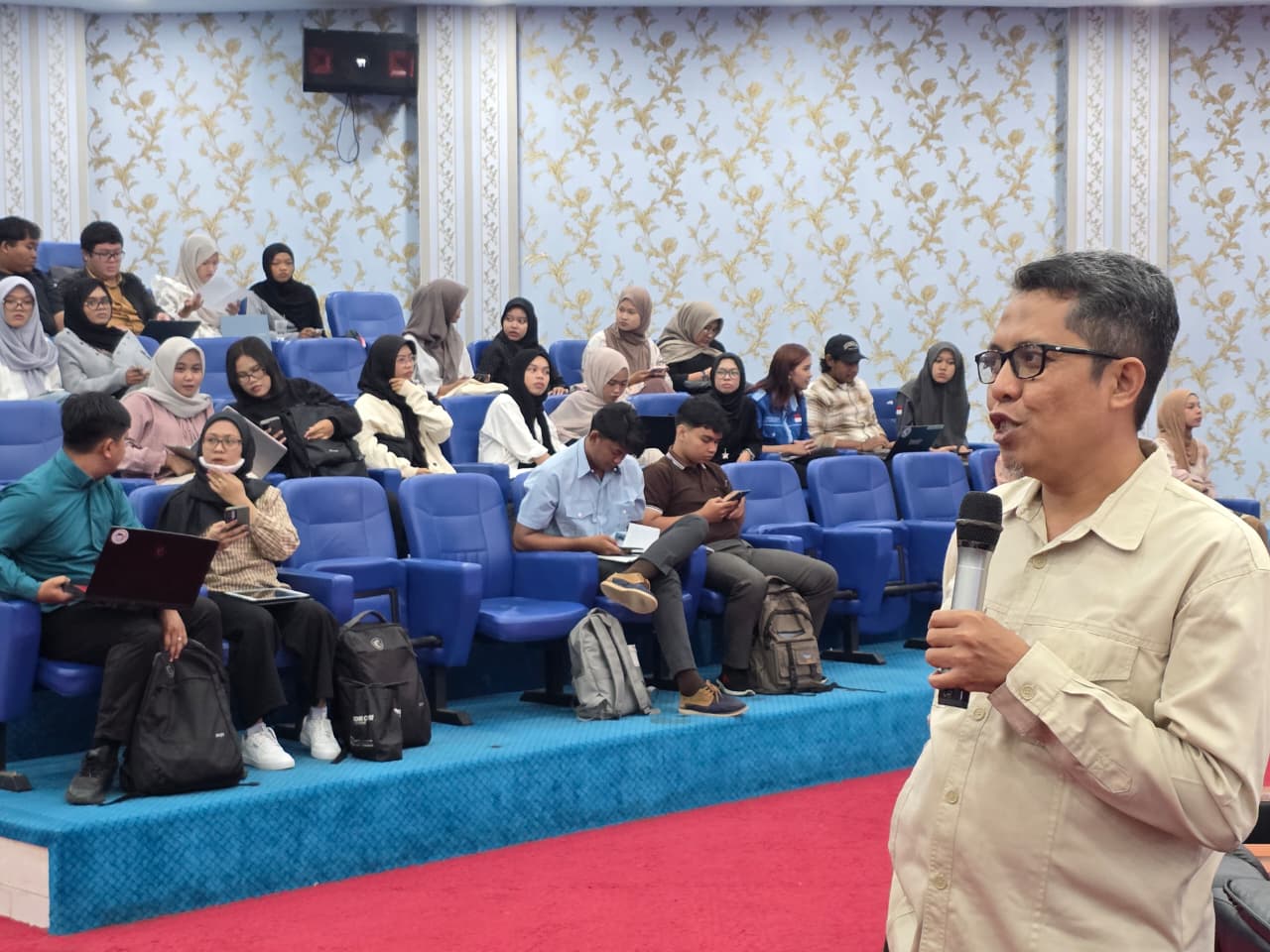Selain pemaparan materi, suasana kegiatan berlangsung interaktif dengan adanya sesi tanya jawab yang aktif antara peserta dan narasumber. Mahasiswa memanfaatkan kesempatan ini untuk menggali lebih dalam terkait teknik penyusunan proposal, pemilihan topik yang relevan, hingga strategi agar proposal memiliki nilai kebaruan dan kebermanfaatan yang tinggi.